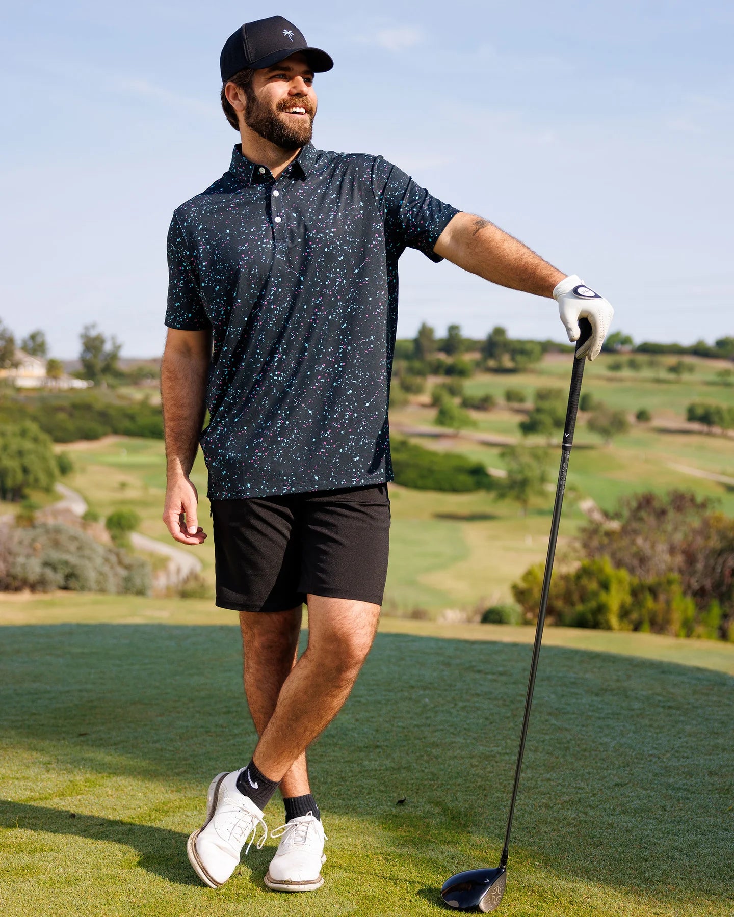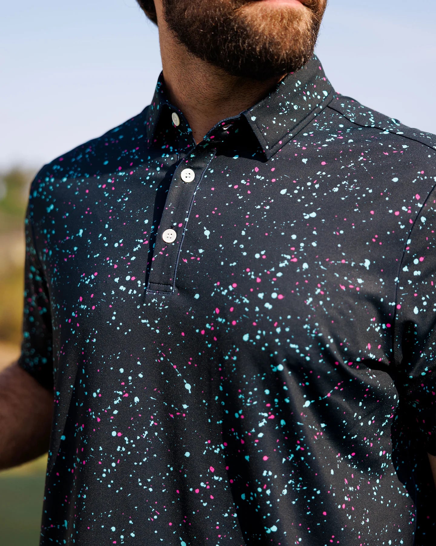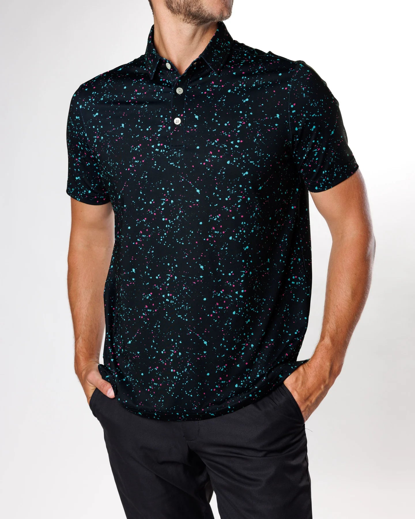 Live out your astronaut dreams and take a trip through the night sky in this pitch black polo scattered with pink and blue speckles. Wear it casually or formally for an outfit that is out of the world.